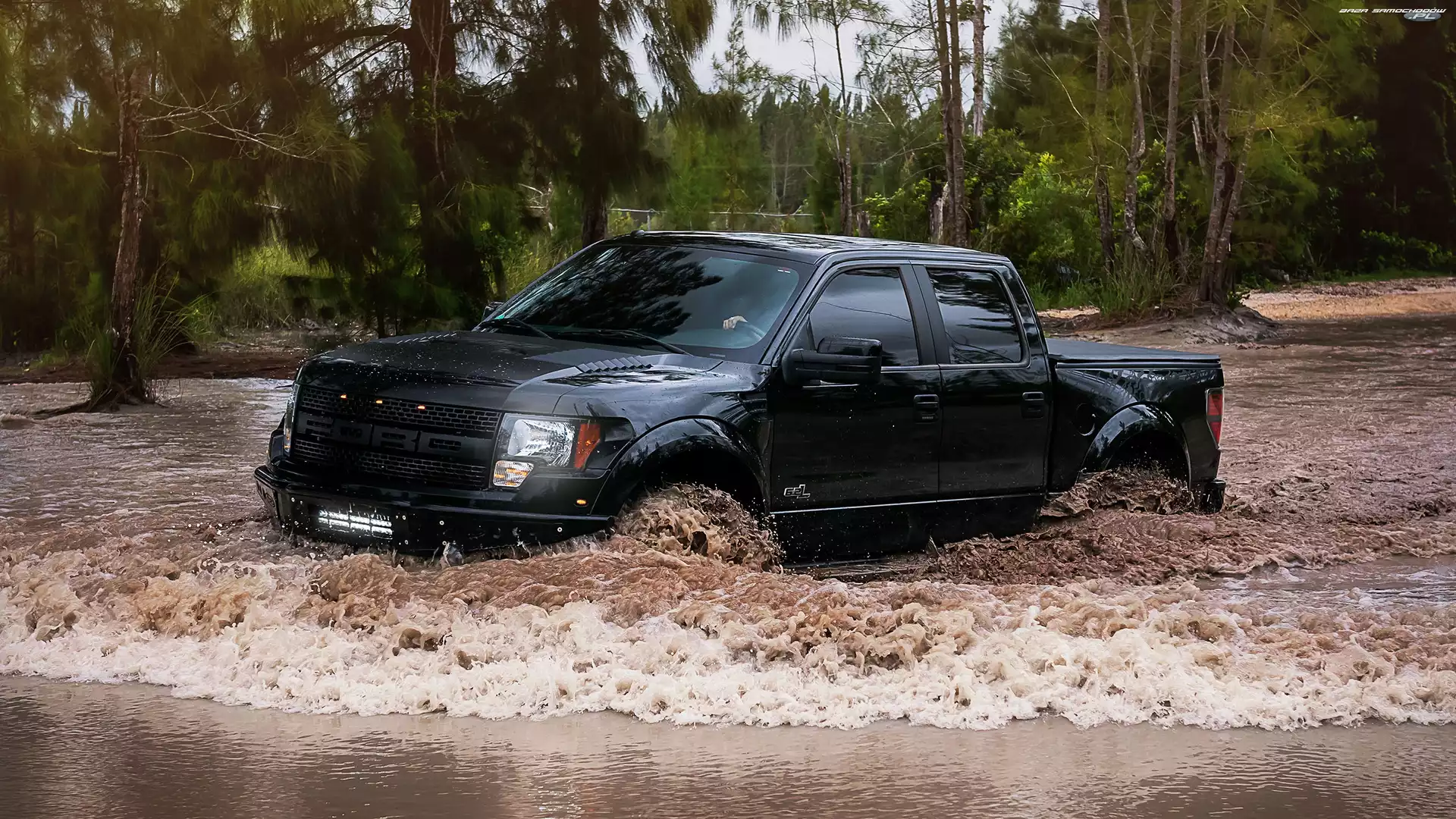Samochód: Raptor, Drzewa, Ford, Rzeka